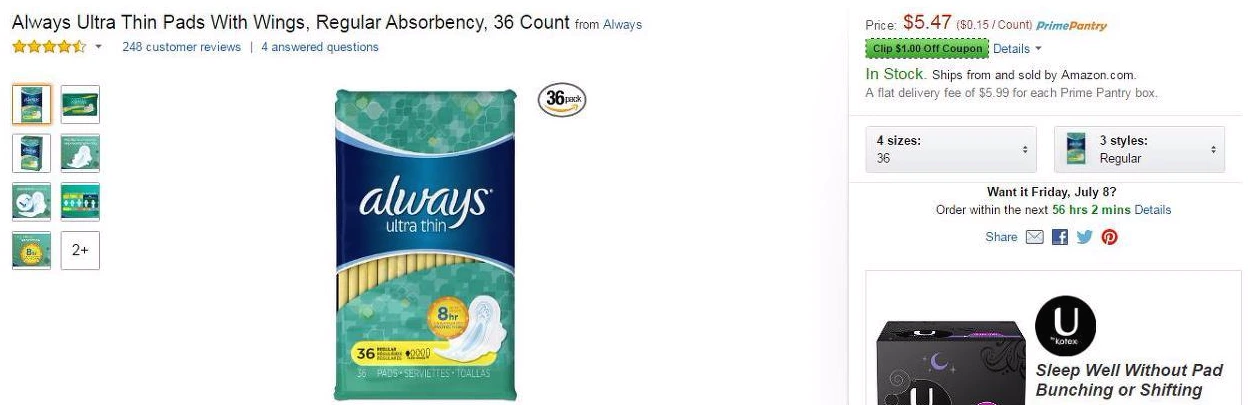 https://www.amazon.com/Always-Ultra-Wings-Regular-Absorbency/dp/B00I3MU11U/ref=pd_sim_467_2?ie=UTF8&dpID=51xKQBn5yHL&dpSrc=sims&preST=_AC_UL160_SR160%2C160_&psc=1&refRID=5YWZGZ3732KCGP2G5G67