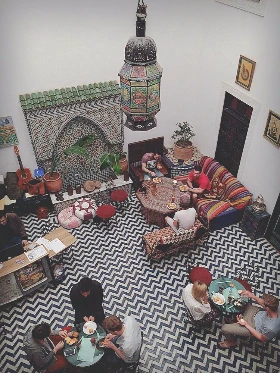 페즈에 도착한 것은 밤 11시가 넘은 늦은 시간이었다. 숙소가 있는 구 시가지 (Old Medina)로 도착했을 때에는 도시는 쥐죽은 듯 고요했고, 어두컴컴한 길에 간간이 보이는 사람들은 모두 남자였다. 친구의 추천을 받아 예약한 거처는 모로코 전통 가옥 형식인 리아드(Riad)를 개조해 만든 호스텔이었다. 리아드의 특징인 화려한 타일로 장식된 아름다운 중정이 제일 먼저 눈을 사로 잡았다.