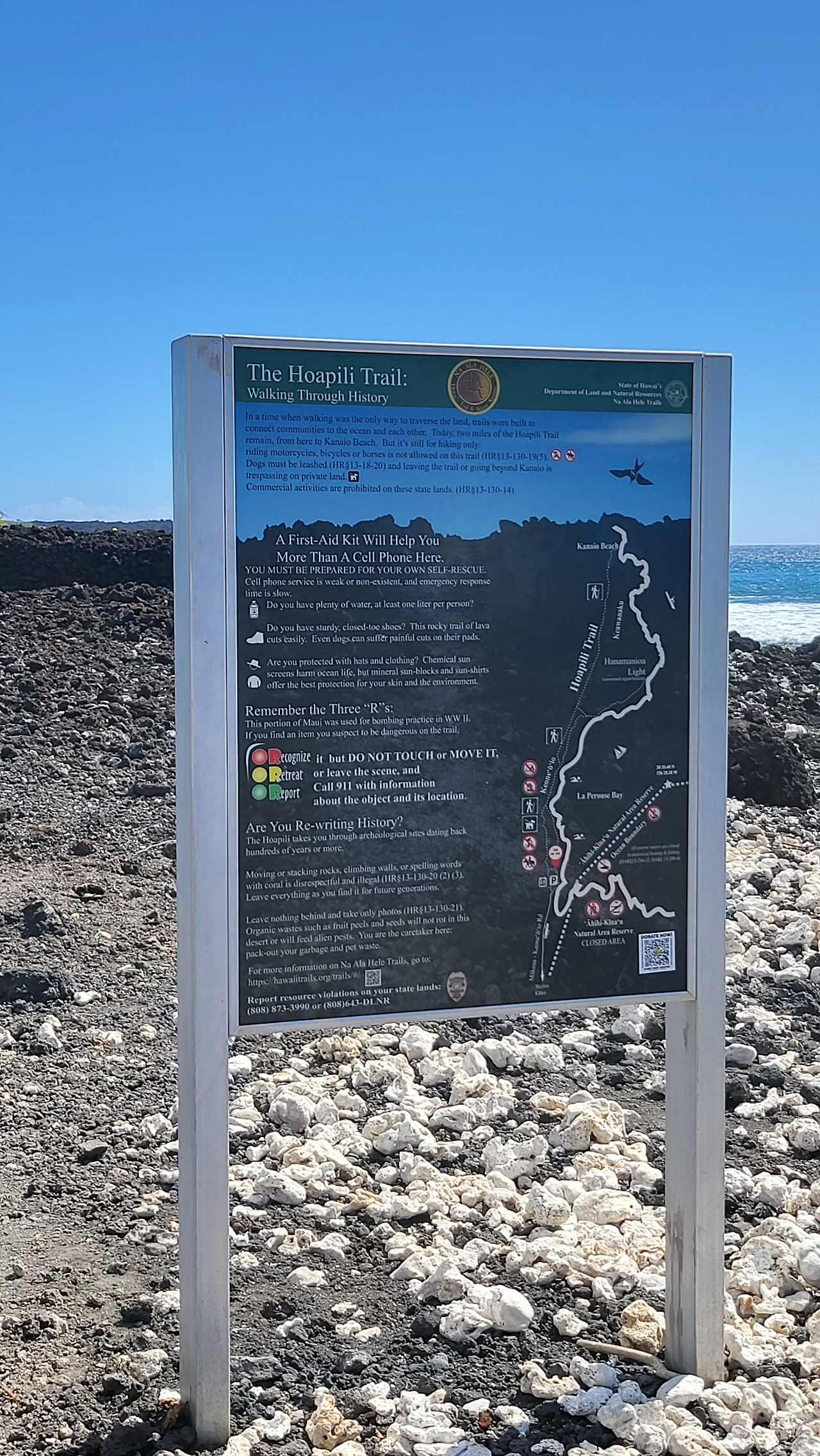 아쉬움이 한 조각도 남지 않을 정도로 눈과 마음을 가득히 채우고서야 차로 돌아가 원래의 목적인 트래킹 코스를 향할 수 있었다. 마우이의 오른쪽 섬 남쪽에 있는 호아필리 트레일이 해안선을 따라 걷는 코스로 괜찮아 보였다. 찰리영 비치에서부터 해안선을 따라 쭉 내려갔다. 다행히 이번에는 공식적인(!) 주차장도 있고, 어엿하게 트레킹 코스에 대한 안내도 나와 있어 안심이 되었다.
