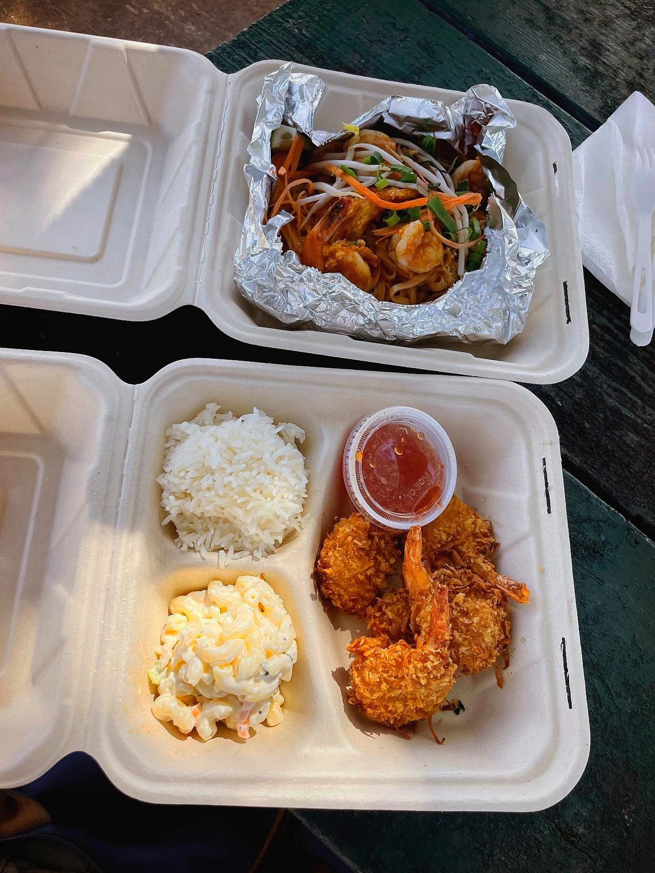하와이 여행을 준비하면서 먹어보고 싶었던 것 중에 하나가 함박 스테이크처럼 생긴 로코모코(느끼함 주의)와 쉬림프 트럭이었다. 이게 맛있으면 뭐 얼마나 맛있겠냐 생각이 들기도 했지만 바다 근처에서 싱싱한 해산물을 먹는 상상을 하는 건 언제나 배시시한 행복을 안겨주지 않는가! 테이크아웃한 음식을 들고 해변 근처 벤치로 향하는데, 박스에서 고소한 냄새가 솔솔 올라왔다. 어떤 맛일지 견딜 수 없이 궁금해졌다.