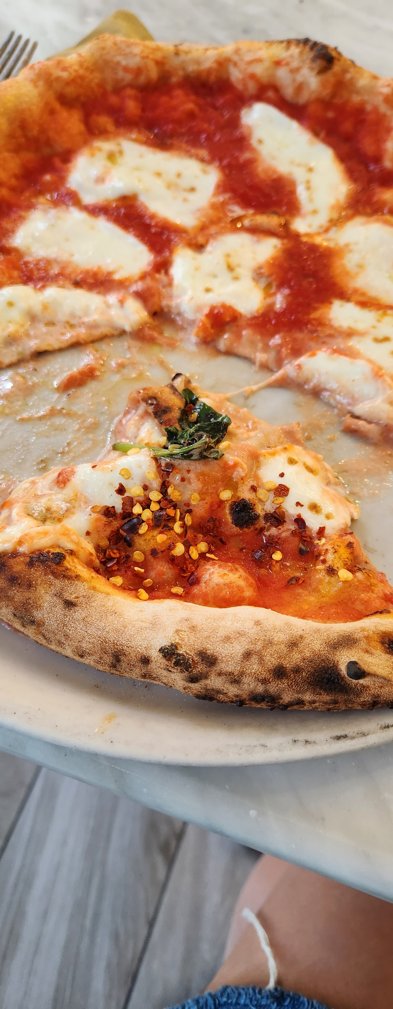 부팔라 치즈를 얹은 마리게리따 피자, 굵은 칠리 가루가 피자 한 판 먹기에는 필수!