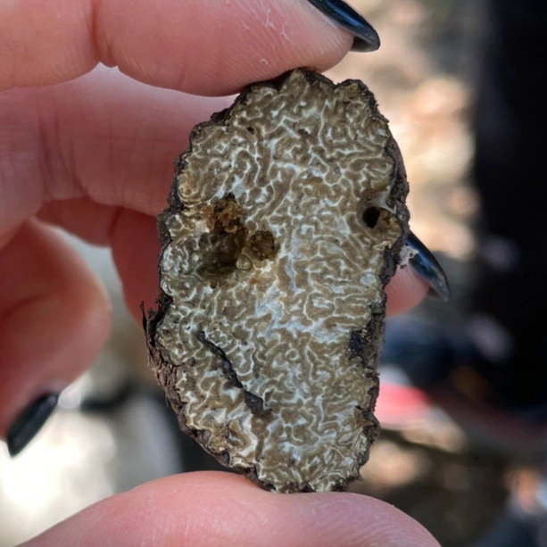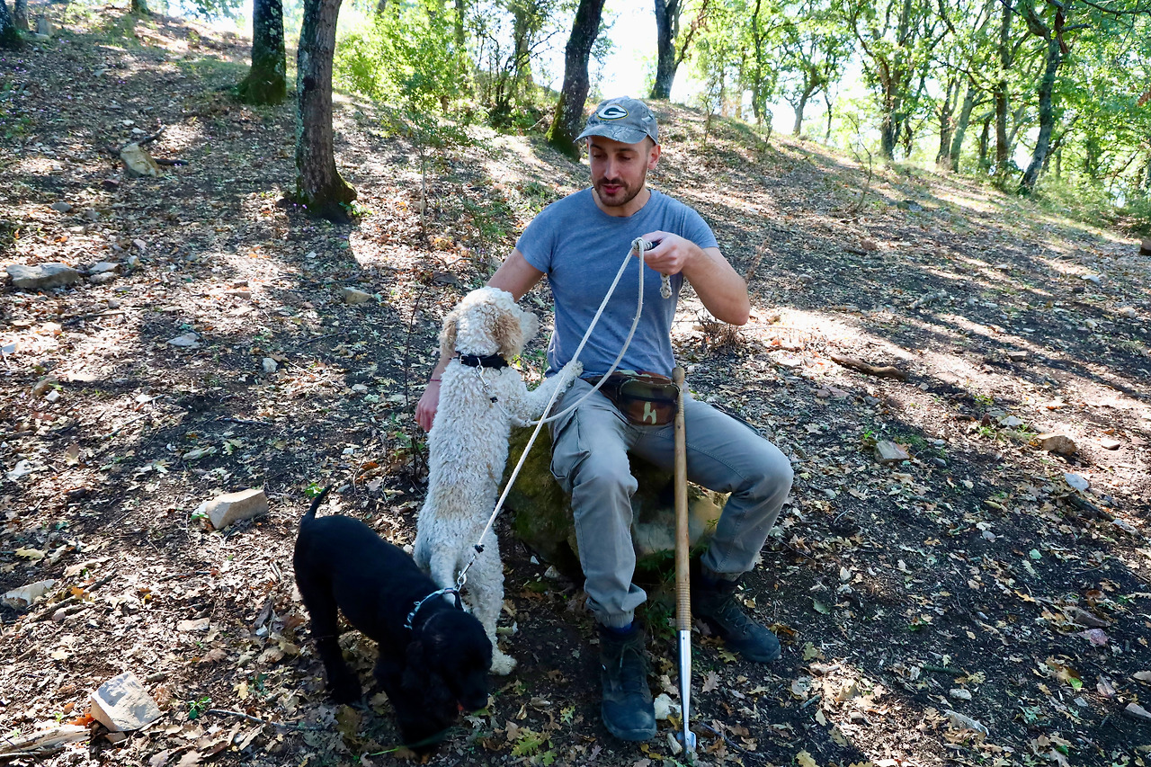 이렇게 발로 파기 시작하면 호스트가 가지고 있는 곡괭이 같은 도구로 단단한 땅을 살짝 깨뜨려 주기도 하고, 트러플이 육안으로 보이기 시작하면 (다소) 거칠게 개를 밀어내는데, 파다 보면 개의 발톱에 트러플이 긁혀 버섯이 잘 상하기 때문이란다. 개들도 날마다 컨디션이 조금씩 다르기 때문에 채취량이 그때그때 다르다고 하는데 다소 노동적인 작업으로 보이긴 해도, 개들이 트러플 찾는 활동을 좋아하고 산속에서 이것저것 구경하는 것도 좋아하기 때문에 스트레스가 있어 보이진 않아서 다행이었다.