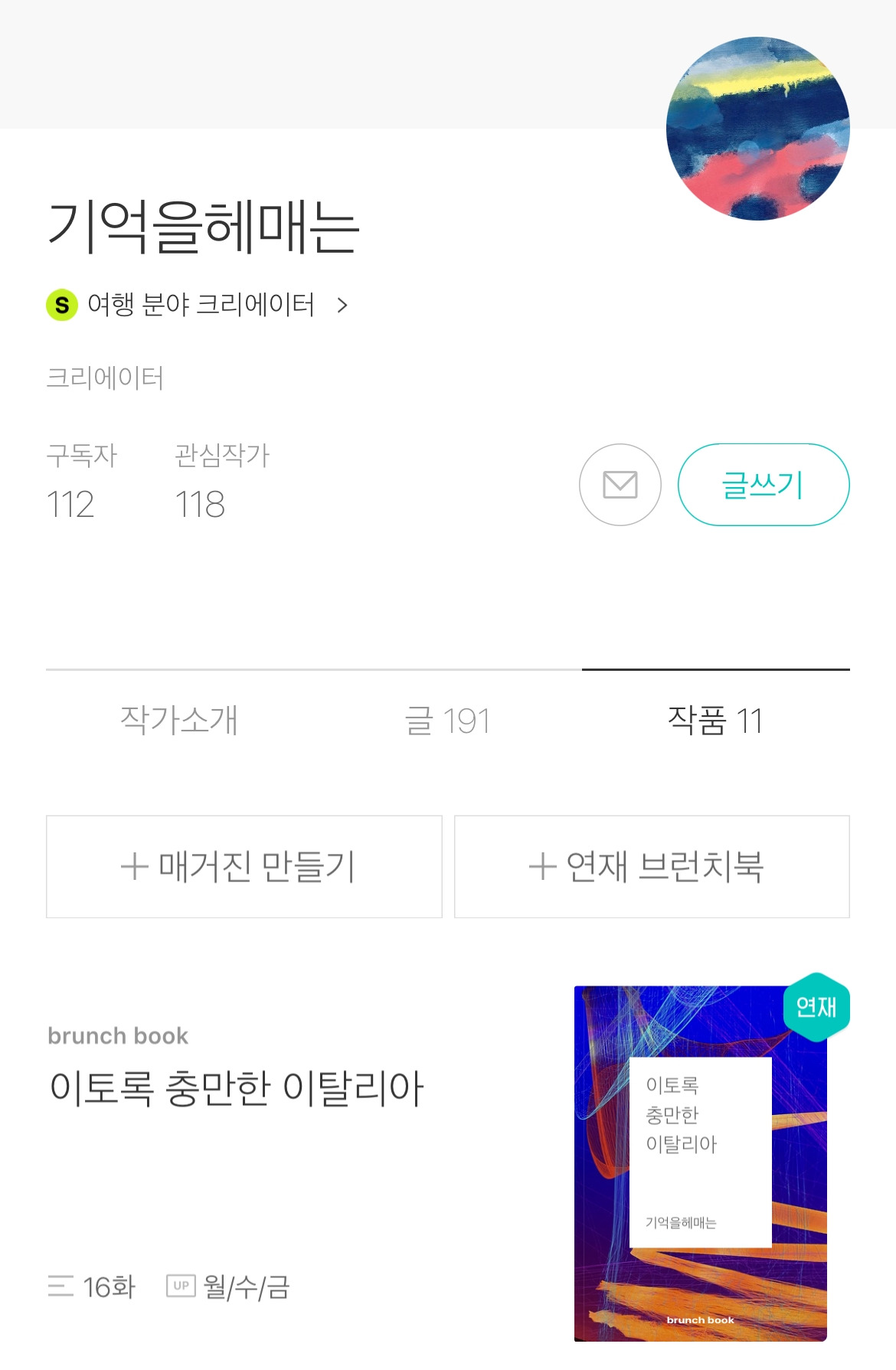 아마도 최근에 연재 브런치북으로 업로드 중이던 <이토록 충만한 이탈리아> 때문에 선정이 된 것 같다. 딱히 기대하지 않았던 결과라 의외로 또 뿌듯하기도하고 설레는 마음도 든다. 사실 궁극적으로는 에세이를 쓰고 읽는 사람이 되고 싶긴 하지만, 인생의 여정 또한 여행 아닌가? 썩 맘에 드는 분류라 생각했다.