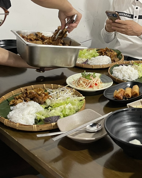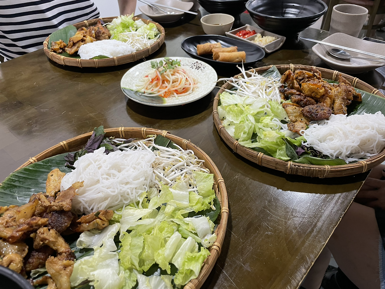 패키지 단체 손님을 위해 미리 셋팅된 테이블에 함께 둘러 앉았다. 한국의 분짜와 거의 비슷한 느낌이기도 했는데, 국물이 훨씬 더 많고 연한 느낌이어서 물국수 말아먹듯이 모든 재료를 빠뜨려서 먹는게 특이했다. 약간의 숯불맛이 나는 돼지고기와 동그랑땡 같은 전과 함께 곁들여 먹으니 화려하진 않지만 나쁘지 않은 식사였다.