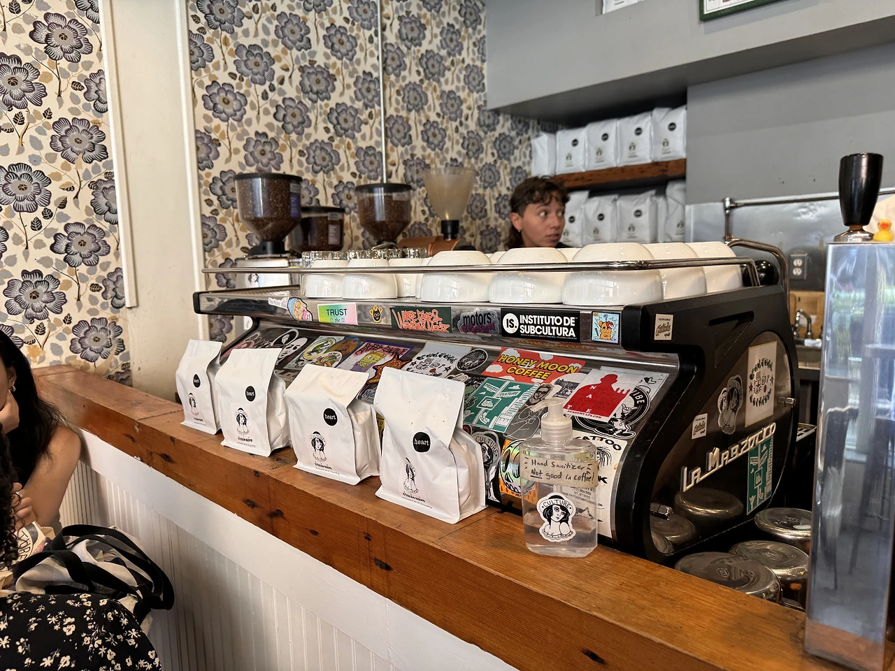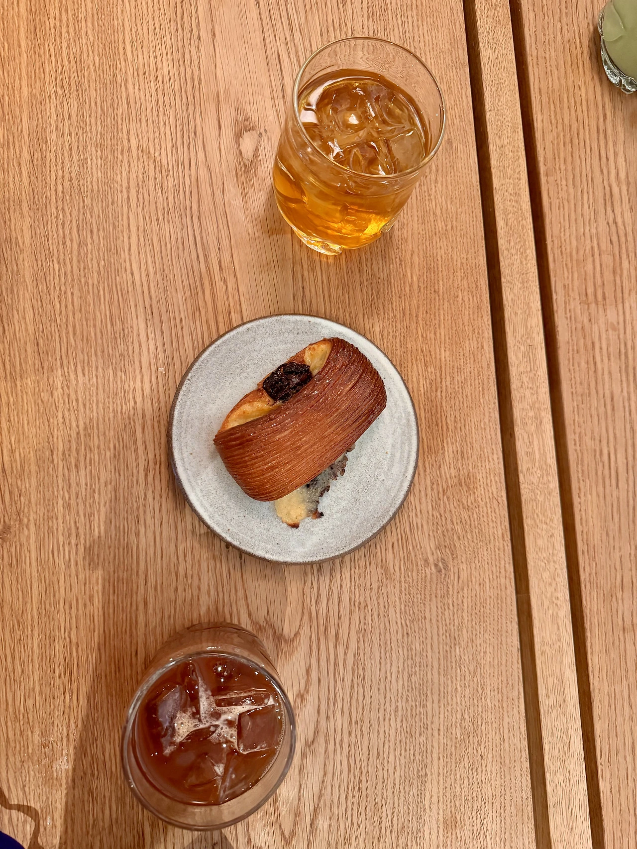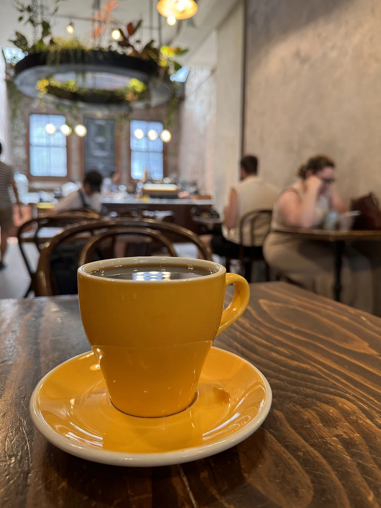 어디선가 봤던 미국인 바리스타의 주머니에 한 손 꽂고 무심하게 내리는 모습이 기억에 각인되어 있었더랬다. 대부분은 에스프레소 메뉴를 마시는 것 같았지만, 다른 커피보다 몇천원 더 비싼 미국식 푸어오버 커피는 어떨까 하고 주문했다. 커피 드립하는 모습을 찍고 싶었던 나는 조심스레 바리스타에게 영상을 찍어도 되겠냐고 물었다. 바리스타는 순간 잠깐 멍해지더니, 그걸 물어봐줘서 고맙다고 했다. 항상 지키긴 어렵지만 나는 다른 사람을 카메라에 담는 걸 조심스럽게 생각하는 사람일 뿐인데, 감사 인사를 들어서 기분이 묘했다. 사람들이 보통 물어보지않고 마구 영상을 찍어대는게 일상적인가 보다 했다. 이 커피는 아직 시차 적응을 못했던 나에게 정말 찐하디 찐한 .. 사약같은(좋은 의미로..) 카페인 수혈이었다. 일반 커피의 3배 정도 농도인 느낌. 유럽에서 마시는 모닝 커피 이후로 오랜만에 느끼는 짙음. 하루에 연거푸 3잔을 마시던 뉴질랜드와 위장이 버텨주던 20대 시절이 잠깐 떠올랐다. 오랫동안 머물기 좋은 멋진 까페였다.