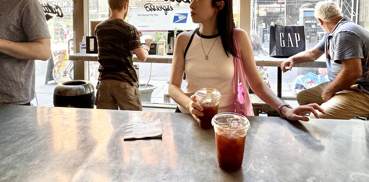 역시 가격은 사악하다. 으레 드립 커피를 다루는 곳 답게 산미 강한 커피 맛. 나는 신 커피를 그닥 좋아하는 편은 아니지만 뉴욕의 드립 커피는 어떤가 하고 마셔봤다. 아이스티는 카페인을 하루에 일정량만 섭취하려는 친구의 선택. 립톤 아이스티랑은 다르게 당이 하나도 안들어가기 때문에 쌉쌀한 맛의 아이스 홍차에 가깝다.