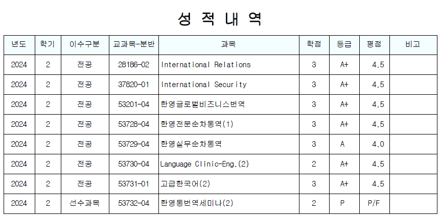 커리큘럼상 수강해야 하는 국제학 수업 International Relations (국제 관계), International Security (국제 안보) 두 개를 비롯해서, 이번 학기에는 한영/영한을 한 수업에서 다뤘던 번역 수업, 한영/영한 통역 수업 하나씩, 그리고 정제된 한국어 글쓰기 및 포스트에디팅을 배우는 고급한국어 수업까지 대부분의 수업에서 A+를 받았다. 나름대로 최선을 다했고, 결과도 만족스럽고, 교수님들의 피드백도 많은 도움이 되었다. 1학기 때보다는 한 뼘이라도 성장했다는 느낌이 얼마나 다행스러운지 모르겠다.