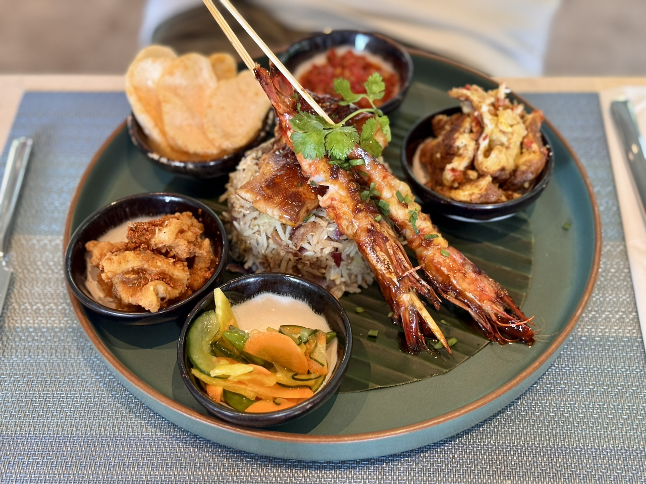 발리에는 나시짬뿌르 라고 하는 가벼운 쌀과 각종 반찬이 나오는 인도네시아 로컬 음식이 유명하다. 나름 발리에서의 첫 끼이니 로컬 음식을 먹어봐야지 하고 주문했다. 같은 아시아 국가 답게 우리나라처럼 밑반찬이 있다는 게 반가운데, 문제는 그 반찬에 들어가는 향신료는 먹어보지 않고 예측이 어렵다는 것. 예쁘기도 하고 맛있기도 했는데, 이상하게 자꾸 얼굴에서 땀이 흘러내린다. 알고보니 매운 고추가 거의 모든 반찬에 들어가 있다! 점점 더 타오르는 듯한 입술과 모든 땀을 배출시킬 듯한 얼굴 상태는 견디기가 힘들어질 정도였다. 그럼에도 음식 맛이 좋아 계속 먹게되는 중독성이 있었다.
