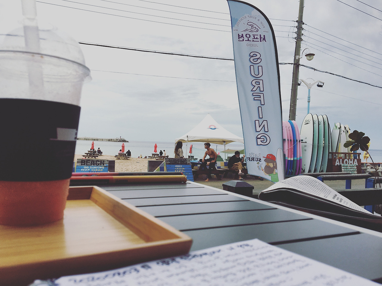 달고나 라떼, 그리고 수박 파인애플 쥬스 한잔 놓고 허여퍼런 바다 표면을 바라보고 있으니 그제야 이곳의 온도, 습도, 속도에 튜닝이 되는 기분이 든다.