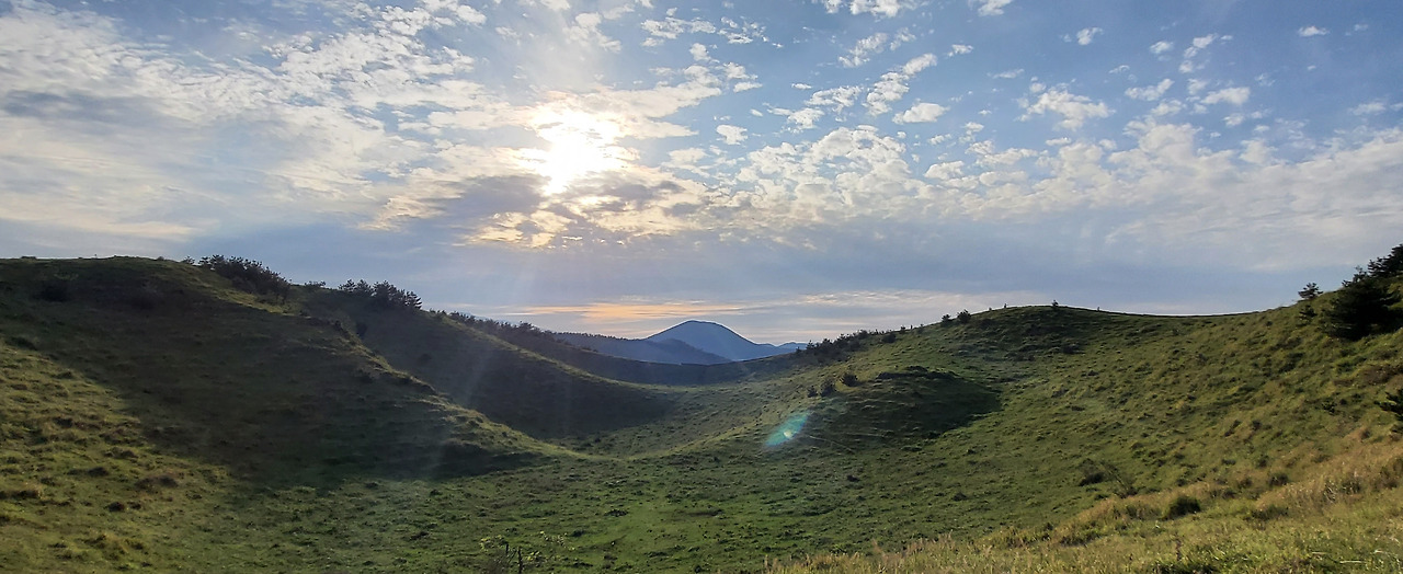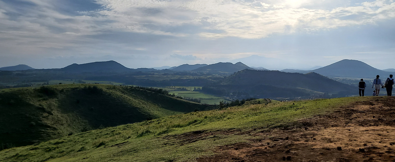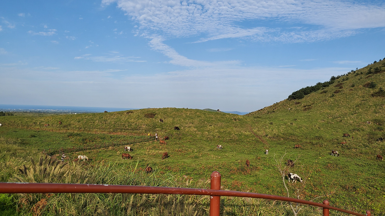 이렇게 순진무구한 동물들의 지극히 현실적인 욕구들이 난장판을 벌인 언덕이라 할지라도 오름은 오름이다. 가장 높은 지대까지 올라서서 저 멀리 내다보니, 굽이 굽이 꿀렁꿀렁 오름 형제들이 멀리서부터, 아주 가까이까지 헤엄쳐 오듯 겹쳐져 둘러싸고 있는 모습이 한눈에 들어왔다. 가슴이 탁 트인다. 산맥의 존재가 너무 뚜렷해서 짙은 외곽의 곡선에 하늘 바탕은 그저 곁들여 놓은 것 같다.