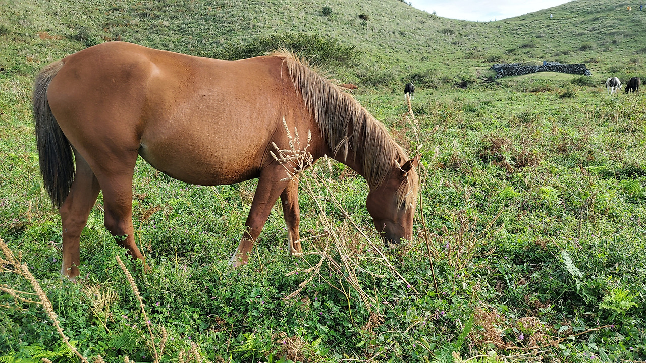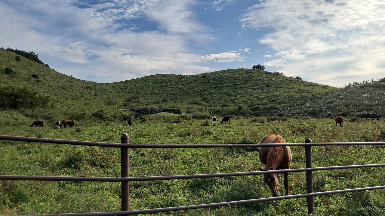 용눈이오름의 산책로는 다랑쉬오름과는 사뭇 다른 각도로 형성되어 있다. 상대적으로 완만하게 길게 걷는 나선 형태로 진행을 하게 되는데, 곳곳에 말들이 초코칩 쿠키의 초코처럼 박혀 있다. 아니, 그냥 말이 말 그대로 정말 많다. 용눈이오름이 아니라, 말 오름이라고 해도 이상하지 않을 정도. 처음에는 오오, 제주스러운 말들이군. 하며 반가워했는데, 조금 걷다 보니 말X을 피해 걷는 게 미션이었다. 정상 부근까지 올라가보면 말이 이 경사진 언덕을 얼마나 높이까지 올라갈 수 있는지를 실질적으로 확인할 수 있다. 그곳에도 말X이 있기 때문이다. 정상 뿐 아니라 어디에든 있다. 이 녀석들이 또 굉장히 매끈한 조약돌 모양을 닮아 있어서, 나중에는 그게 그게 아닌데도 솥뚜껑 보고 놀라는 것처럼 돌만 봐도 발을 들어 올리며 펄쩍 뛰게 되었다.
