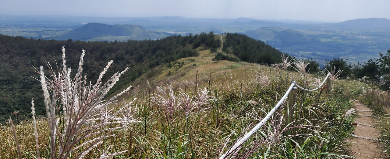 오름의 움푹 파인 구멍의 테두리 부분 전체가 둥그렇게 산책로인 셈인데, 오르막길을 힘차게 오르고 올라 그 원주의 한 점에 다다른 것이었다. 고생 끝, 행복 시작이었다. 그렇게 쭉 테두리 산책로를 따라 원점으로 돌아가기만 하면 되었다.