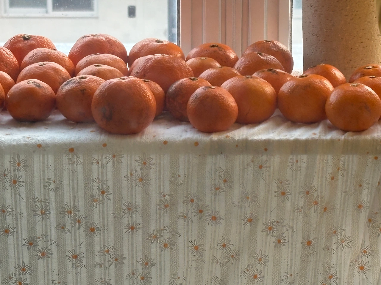 드디어 오늘 뜯은 박스 안에는 작고 큰 귤들이 옹기종기 모여있다. 세척이 필요한 유기농 귤이었기 때문에 선희선생님만큼은 아니었겠지만, 그래도 정성껏 한 알 한 알 성한 곳은 없는지 만져보며 큰 대접에 옮겨 담았다. 베이킹파우더와 미지근한 물을 섞어 5분 동안 담가두고, 또 한알씩 수건으로 닦으며 집안 곳곳에 올려두었다. 바람이 잘 드나드는 베란다에도 스무 알, 따뜻한 거실 TV아래에 서른다섯 알, 그리고 내가 만든 과일 바구니에는 열 알 정도, 그리고 정리하면서 까먹은 여섯 알까지.