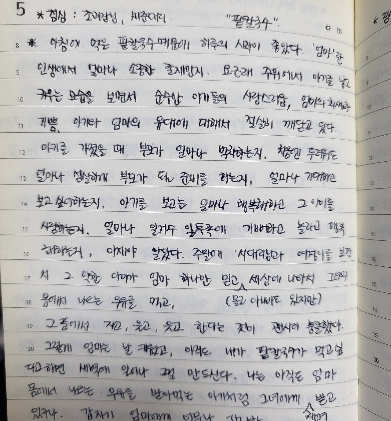 2013년11월5일 일기의 시작이 ‘아침에 먹은 팥칼국수 때문에 하루의 시작이 좋았다’인걸 보니, 그날도 엄마가 아침부터 분주히 움직여 팥칼국수를 만들어 주셨던 모양이다. 엄마는 늘 칼국수를 사지 않고 반죽을 밀어서 만드셨다. 팥물은 언제나 아주 걸쭉하게 직접 만드셨고, 끓이는 중간중간 계속 저어주기까지 해야 하니 분명 손이 많이 가고 만들기 번거로우실 텐데도, 엄마는 늘 그 방법으로 팥칼국수를 만드셨다. 그래서인지 나에게도 팥죽은 달지 않은 걸쭉한 국물에 투박한 국수가 있는 그 팥칼국수이다(엄마의 고향은 전라도이고, 호남에서는 팥칼국수가 정통 ‘팥죽’이었다고 한다. 새알심이 들어가는 팥죽은 ‘동지팥죽’이라고 부른다).