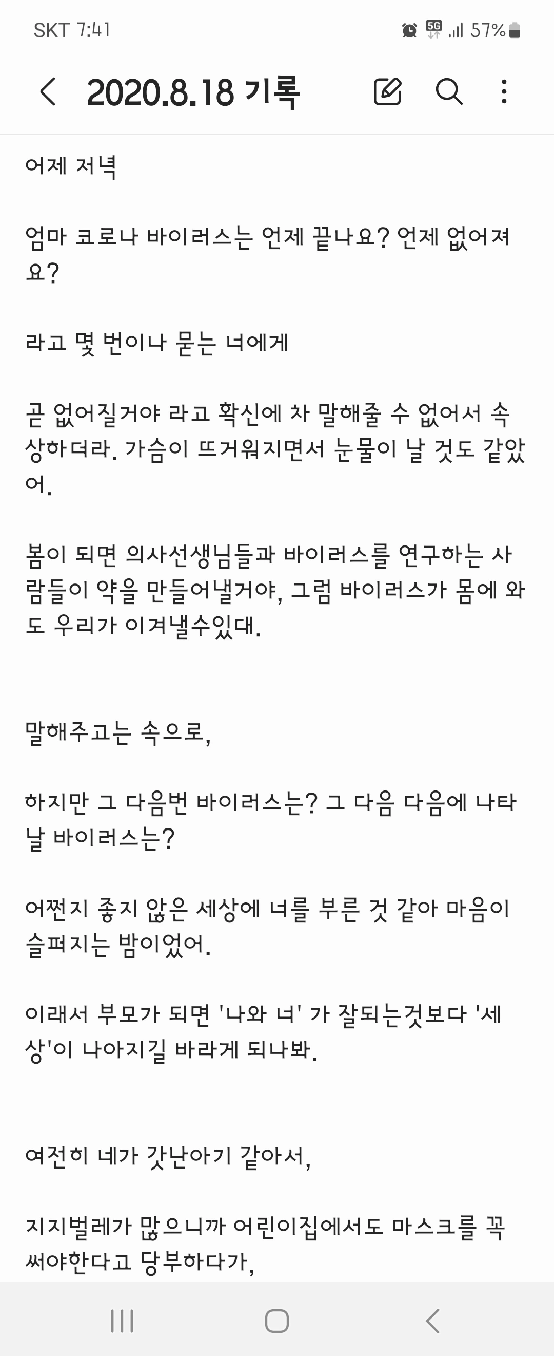 하지만 그래도, 너무나 ‘쓰고’ 싶은 순간들이 있었다. 그럴 때는 휴대폰에 짧은 메모를 남기곤 했는데, 2020년 여름에 남겼던 메모에 대해서 쓰려고 한다(아이가 네 살이 된 해이다).