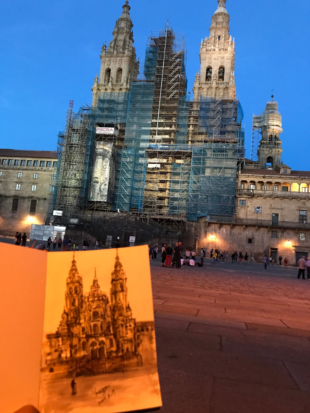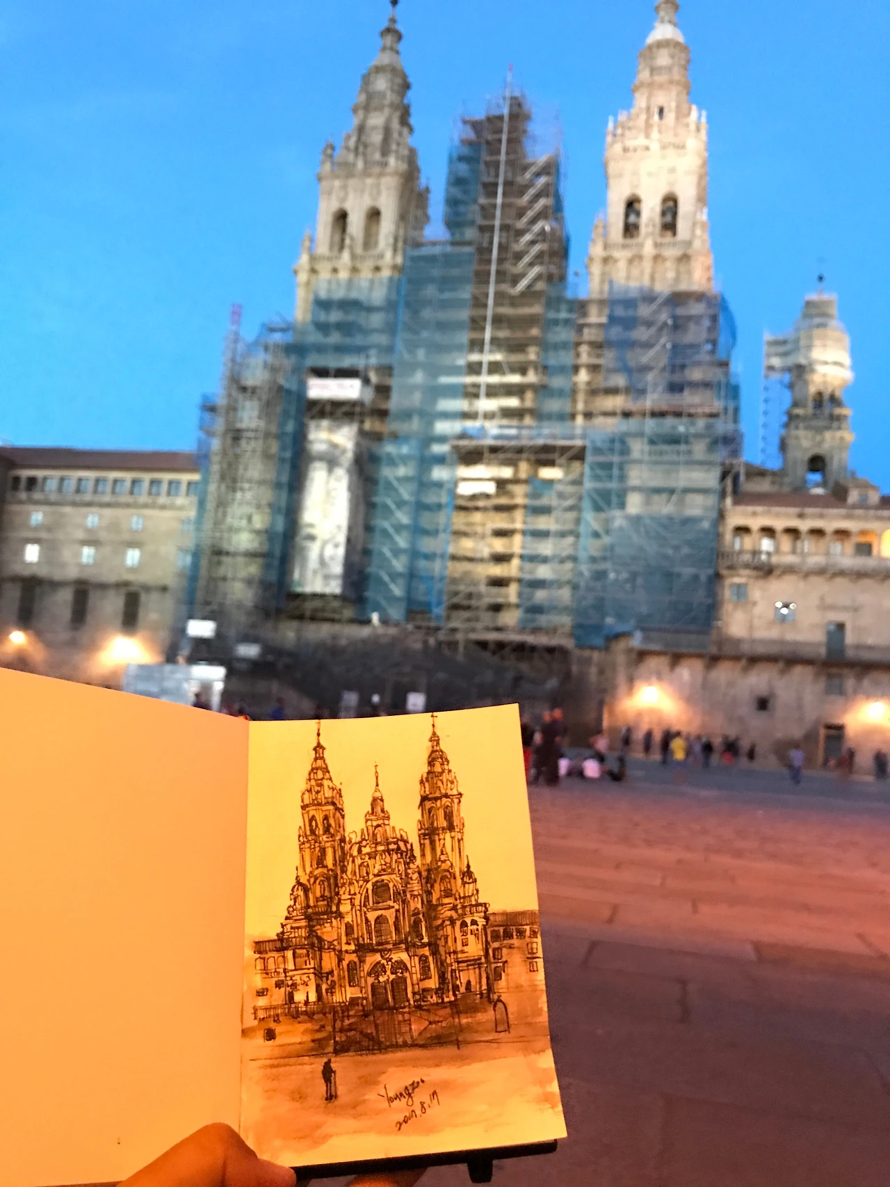 공사판이였지만 난 개의치 않겠다는 의지. 이그림도 성당앞에서 해가 지도록 그렸던거 같아요. 앞에 깨알 순례자의 모습도.. (접니다)