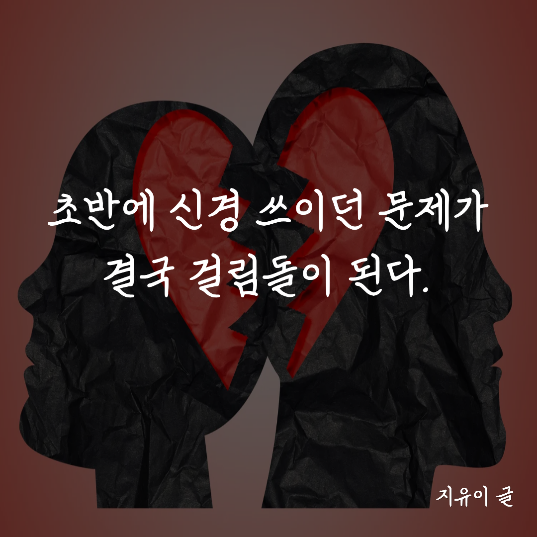 생각이 많아지는 연애는 결국 끝까지 갈 수 없다. 마음이 편안해지고 물 흐르듯 흘러가는 연애가 결국 별 탈 없이 오래간다. 결국 헤어지게 될 연애는 본인이 어떤 느낌인지 충분히 느끼게 된다. 그 사람과 헤어지면 내 인생의 일부가 없어지는 것 같아 불안함이 밀려들지만 이별의 순간을 겪은 후 남는 건 좀 더 일찍 헤어질 걸이라는 아쉬움과 아예 시작도 하지 말걸이라는 후회일 뿐.