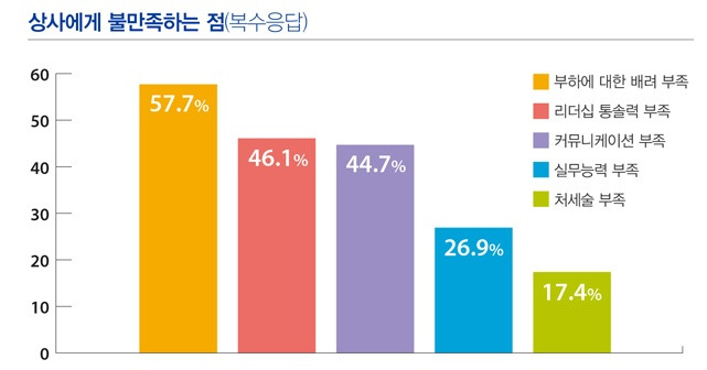 모든 직원이 상사에게 불만이 있는 것은 아닐 것입니다. 불만이 없는 직원도 있다는 가정을 하면, 상사의 능력과 노력이 부족하다고 이야기할 수도 있습니다. 그러나 저는 회사의 조직 시스템이 부하직원들에게 불만을 야기시키는 상사를 만들어 이러한 설문 결과가 나오는 것이 아닐까 생각합니다. 관련하여 이전에 제가 작성하였던 '#3 CEO의 속마음'을 먼저 읽어 보시면 좋을 듯합니다.