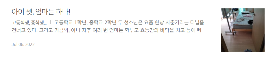고등학교 1학년, 중학교 2학년 두 청소년은 요즘 한창 사춘기라는 터널을 건너고 있다. 그리고 가끔씩, 아니 자주 여러 번 엄마는 학부모 효능감의 바닥을 치고 늪에 빠져 허우적거리고 있다. 나도 그랬을까?, 그랬나?를 가끔은 되새기지만 나는 안 그랬던 것 같다. 공부도 공부이지만 두 녀석의 생활태도 때문에 연중 말씨름 중이지만 고쳐질 기미가 보이지 않아 두 손, 두 발 다 들고 입닥틀인지 입틀막인지... 아무 소리 안 하고 방을 치워준다. 들어먹지 않는 녀석들 한데 내 입만 아프고 이로 인해 2차전, 3차전 길어지기만 한다. 어찌 저리 살까? 적어도 잠자고 난 이부자리만큼이라도 정갈하게 정리하자! 수천번을 이야기했건만 소귀에 경읽기다!