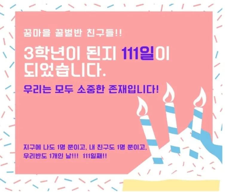 111데이는 이런 날이다. 이 지구상에 나도 하나, 내 옆 친구도 하나, 우리 반도 하나임을 기념하는 날이다. 나는 이 세계에 하나밖에 없는 정말 소중한 사람이라는 것과 내 옆의 친구도 나만큼 소중한 사람이라는 것을 기억했으면 좋겠다. 또한 우리가 한 반으로 만난 것은 엄청난 일이라는 것을 잊지 않았으면 했다. 우리 반도 이 지구상에 하나뿐이니까.