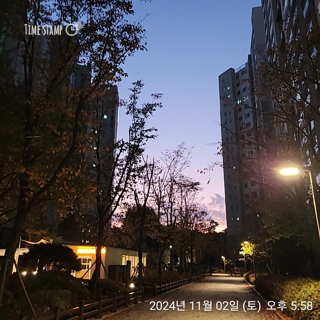 해가 뉘엿뉘엿 지고 있다. 연보랏빛 하늘이 예쁘다. 한 참을 뛰고 달리기 정리를 할 판인데 남편이 내려왔다. 남편 뱃살을 보니 안 되겠다 싶어 함께 두어 바퀴를 더 뛰고 걸었다.