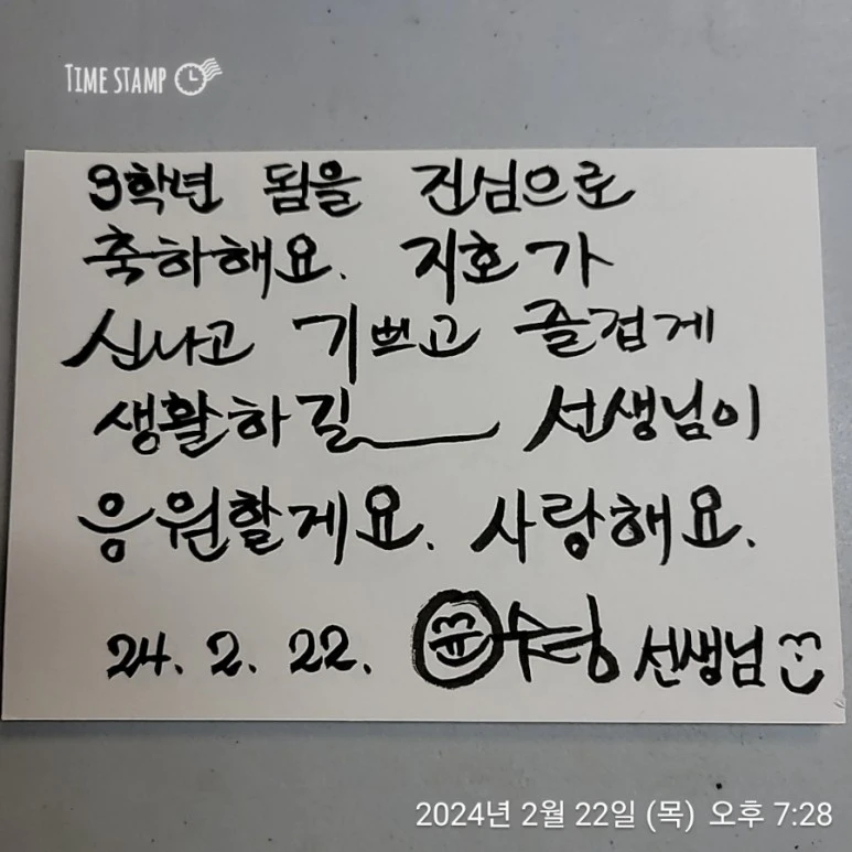 오늘의 하이라이트, 환영 카드 건네며 축하식 하기를 진행했다. 아이들에게 지난 2월 봄방학 동안 선생님이 너희들을 생각하며 정성을 다해 썼다며 너스레를 떨며 아이들 한 명 한 명을 칠판 앞으로 불렀다. 그리고 카드를 건네며 축하한다는 인사를 함께해 주었다. 아이들이 웃음 가득한 얼굴로 내가 쓴 카드를 조심히 받아 가는 모습에 흐뭇했다. 알림장 첫 면에 그 환영 카드를 붙여가게 했다. 집에 계시는 부모님께도 너희들의 3학년 진급을 선생님 응원하고 축하한다고 했다는 말을 꼭 전하도록 안내했다. 진심이다. 아이들의 첫날을 축하하고 격려하는 내 마음이 작은 카드이지만 잘 전달이 되었으면 좋겠다. 일단 아이들은 대 성공인듯하다.