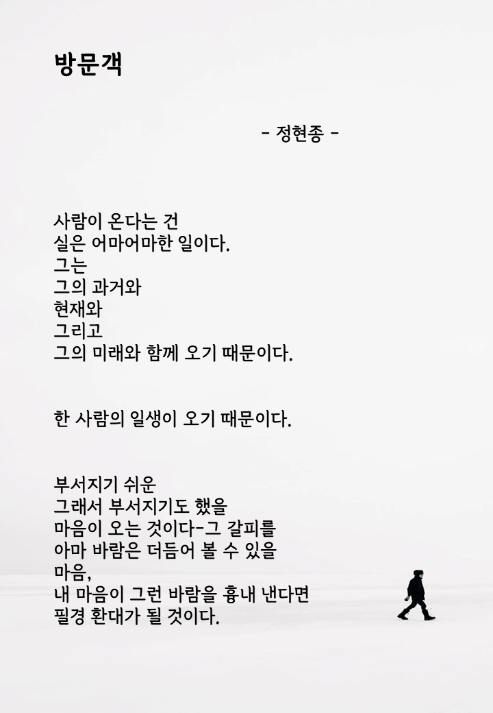 지난주 수요일은 학부모 총회가 있었다. 우리 반은 총 30명인데 20명의 학부모가 왔다. 내 소개를 하고 정현종 시인의 <방문객>을 소개하며 아이들의 과거와 오늘과 미래가 나에게 왔기에 올 1년을 최선을 다하겠다는 내 마음을 전하였다.