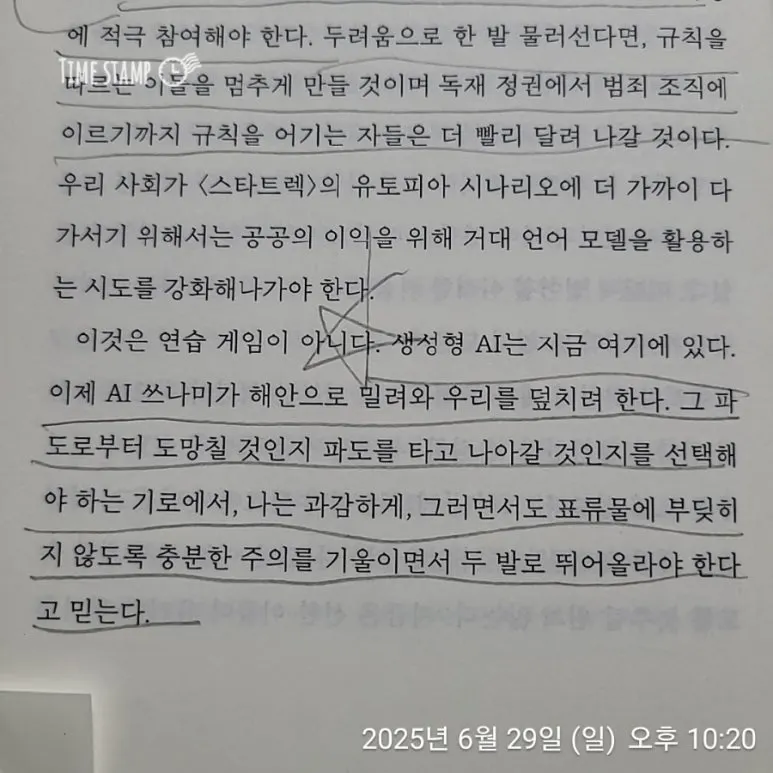 AI는 이미 우리 곁에 와 있다. 마치 쓰나미처럼 우리를 덮치고 있다. 우리는 도망칠 것인가, 아니면 그 파도를 타고 나아갈 것인가? 이 기술을 책임 있게, 선의로 사용해야 한다는 명확한 사회적 합의와 윤리적 통제가 필요하다. 개인교사 역할을 하는 AI가 한 교사가 감당하기 어려운 학급 내 다양한 아이들에게 맞춤형 동기를 부여할 수 있다면, 우리는 지금의 한계를 넘어선 새로운 교육의 길을 만들 수 있다.
