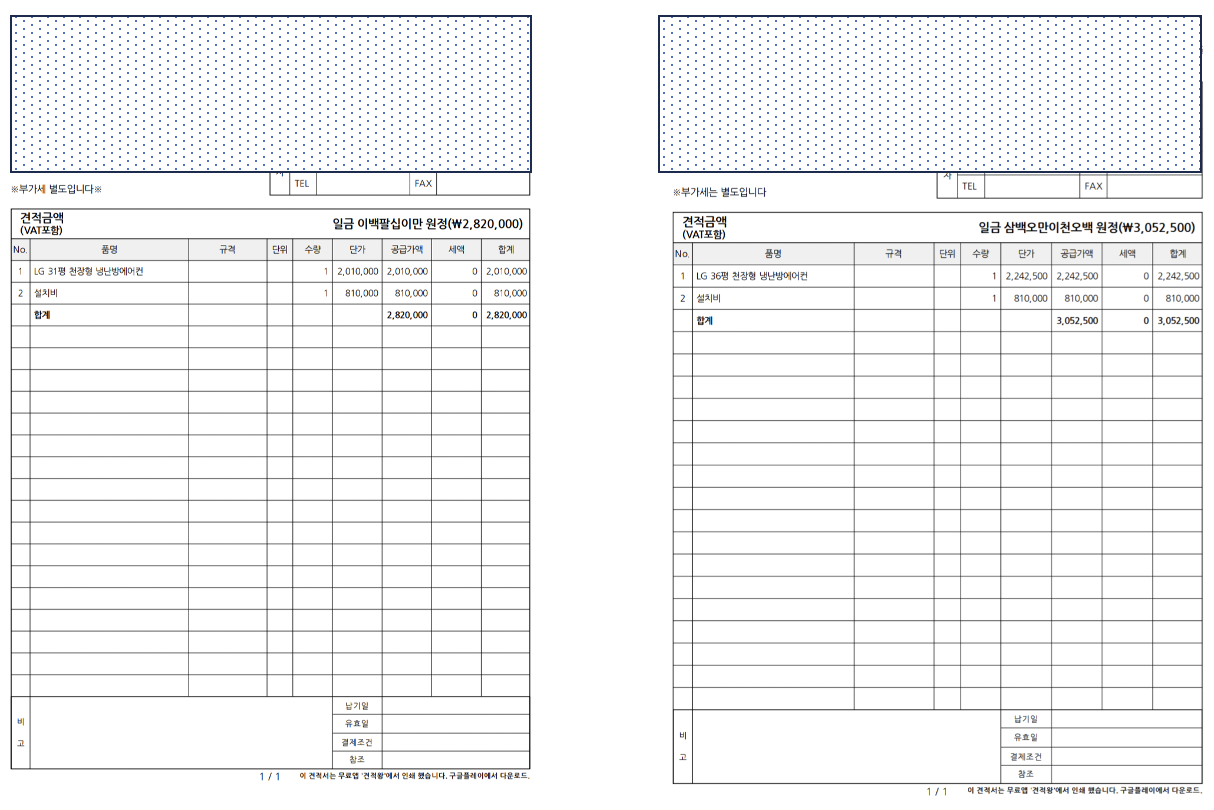 처음에 공간대비 1대면 충분하리라 생각했다. 그래서 천정형 36평을 문의한 후, 실제로는 31평형 1대를 설치했다. 아래는 견적 내용이다 (22년 하반기-겨울 기준)