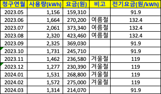아래는 2023년 5월부터 24년 3월까지 실제 지출한 전기요금표이다. 2023년 8, 9월을 비교하면 9월에 오히려 8월보다 전력을 5kWh 많이 사용했음에도 적용 요금이 달라서 요금이 훨씬 적게 나온 걸 확인할 수 있다. 이 전기사용량의 대부분은 에어컨 실외기가 차지한다.