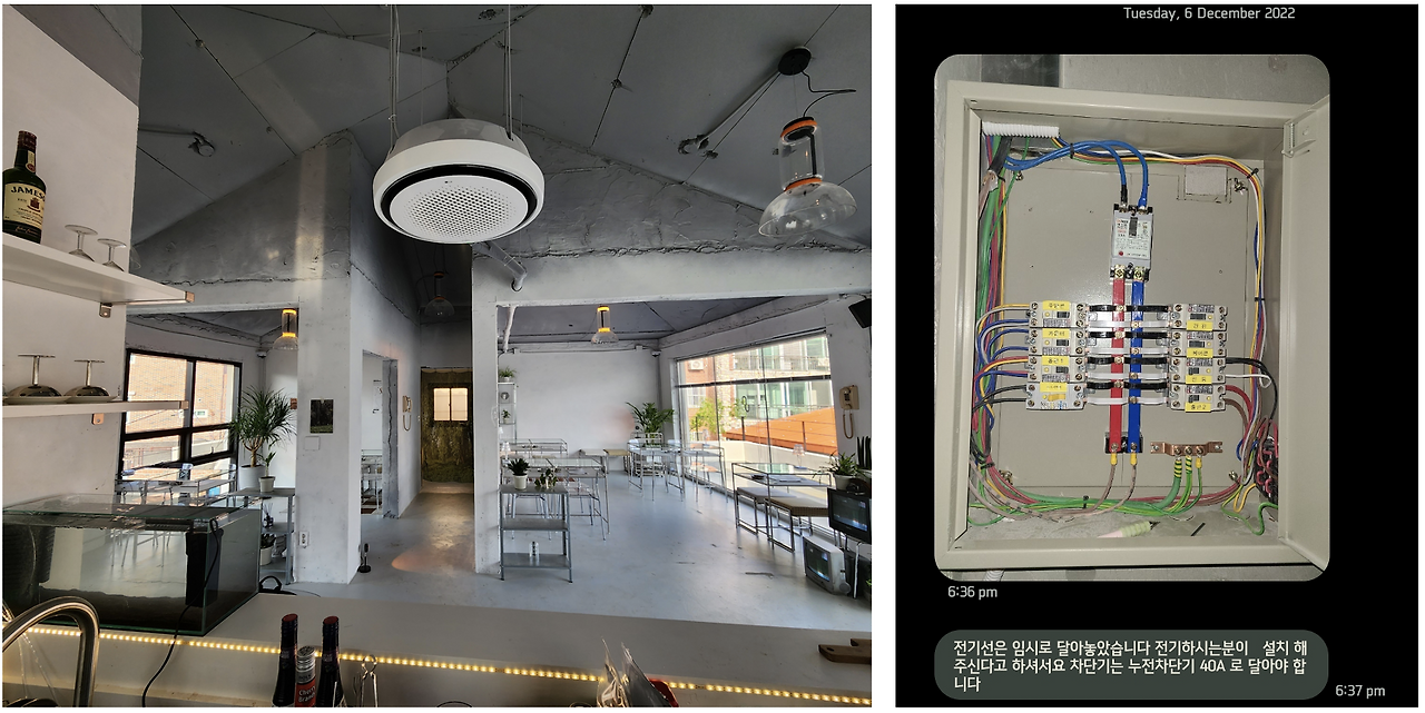 아래 사진처럼 천정형 에어컨 1대를 설치하고 배선을 연결했다. 에어컨은 위에서 언급했듯이 전기를 가장 많이 먹는 품목이기 때문에 반드시 별도의 누전차단기를 달아줘야 한다. 그럴 일은 없겠지만 만약 용량이 작은 차단기에 같이 물리게 되면 정말 100% 차단기가 계속 떨어질 테다.