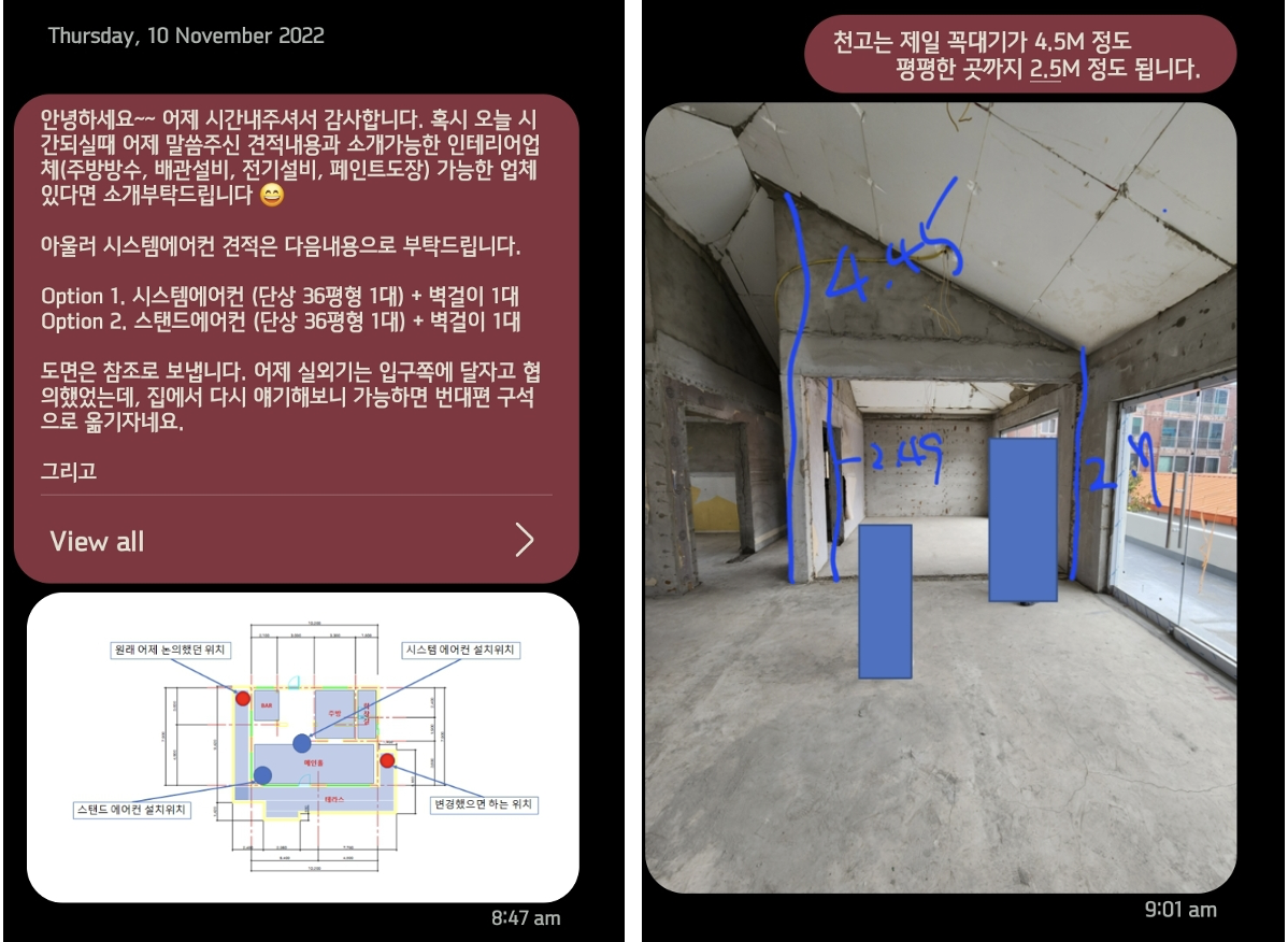 물론 시공사에서는 1대 가지고 겨울에는 괜찮을 지 모르지만 여름에는 부족할 수도 있다고 했는데 실제로 여름에 너무 더워서 추가로 벽걸이 2대를 설치하긴 했다. 시공사에는 평수 대비 고깃집은 많게는 실평수 기준 3~4배수까지, 일반 음식점 같은 경우 2배수로 설치하면 운영하는 데 지장이 없다고 했는데 틀린 말이 아니었다. (처음에는 설마...했지만 전문가의 말을 들었어야 했다..!!)
