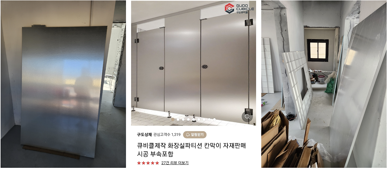 마찬가지로 화장실 파티션은 인터넷을 보니 큐비클을 별도로 판매하긴 하던데 솔직히 직접 설치할 생각은 아니었다. 주문하면 설치까지 된다길래 주문하려 했는데 김해는 방문설치가 안된다고 해서 셀프설치를 했을 뿐이다. 파티션 설치는 어렵다기보다 각 부자재를 설치할 위치에 구멍을 뚫는 작업을 신중하게 해야 해서 까다로웠다. 특히 화장실 파티션의 두께를 고려하지 않고 주문을 하는 바람에 파티션을 단을 높여놓은 가장자리에 겨우겨우 설치할 수 있었다. 너무 가장자리에 구멍을 뚫으면 안정적으로 설치가 되지 않을 수 있어 조마조마했지만 그나마 공간이 조금 나와서 설치가 가능했다.