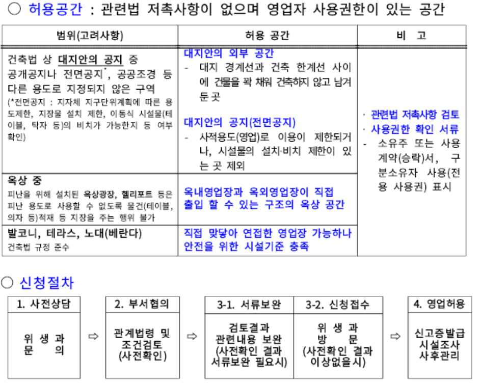 내용을 들어보니 1층 카페에서 테라스에 테이블 3개를 놓고 영업을 하는데 누가 민원을 넣어서 옥외영업신고를 적법하게 받은 게 아니니 옥외영업신고를 하라는 시정명령이 왔다는 듯 했다. 찾아보니 관할청은 위생과였고, 옥외영업으로 추가되는 면적만 추가로 변경신고하면 크게 문제될 게 없어보였다.