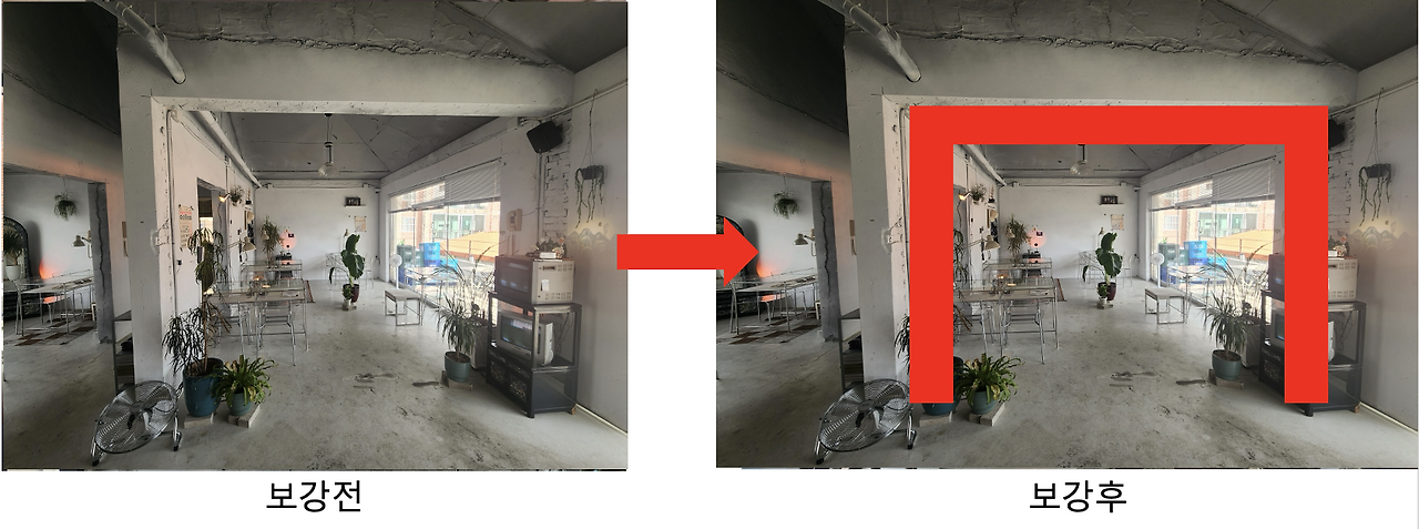 더 황당했던 부분은 들고 온 변경후 예상도면에는 B홀 안쪽 벽체가 그려져 있지 않았는데, 그래서 그 부분을 지적했더니 다시 한번 확인해보겠다고 했다. 심지어는 해당 부분은 우리가 인테리어 상으로 옮길 수 없는 전선이 지나가서 당장 보강일정을 잡기가 어렵다고 했더니, 해당 부분은 내력벽이 아닌 듯해서 보강을 굳이 안해도 될 것 같다면서 건축사무소랑 의논해보겠다고 하더라.