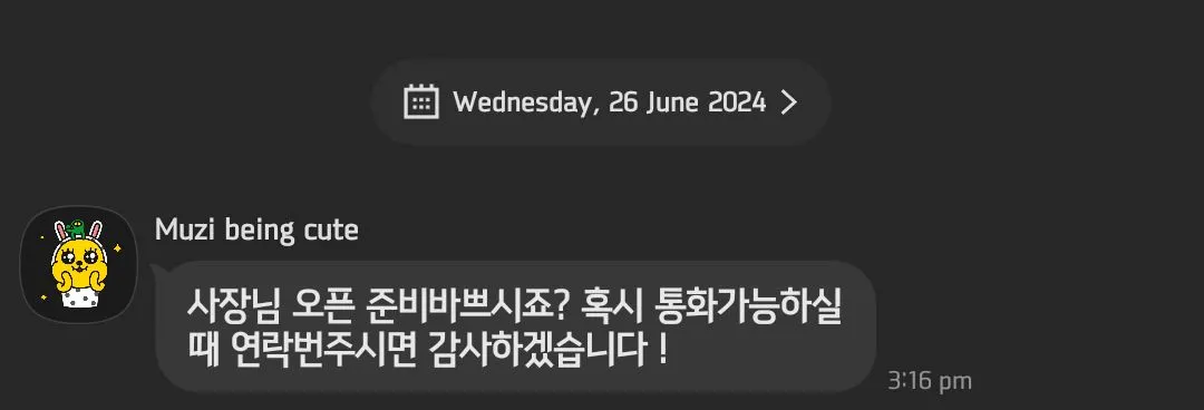 나른한 수요일 오후, 오픈준비가 한창인데 집주인으로부터 카톡이 왔다. 현재 가게로 임차중인 건물은 김해에 있지만 집주인은 울산에서 거주중이라 항상 무슨 연락이 올 때면, 1층으로 물이 새서 보수를 해야한다거나 (집주인이 난간을 설치하고 테라스 증축시 방수를 제대로 안해서 생긴...), 수도세가 갑자기 많이 나와서 물어본다는 둥 뭔가 크든 작든 사건이 터졌음을 알리는 신호라 괜시리 불안했다.