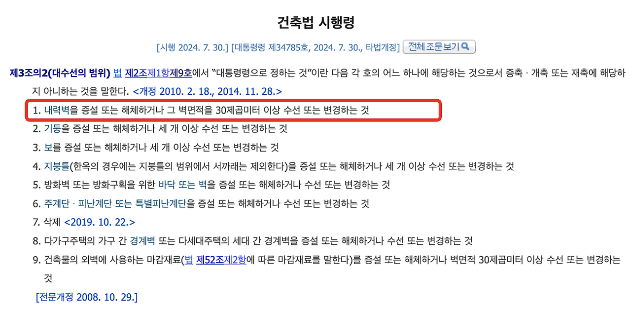 건축법제2조(정의) 1항9호에서 '대수선'을 다음과 같이 정의하며 그 중 문제가 되는 부분은 대통령령으로 정하는 대수선의 범위, 건축법 시행령 제3조의2제1호에 해당하는 내력벽 변경부분이다.
