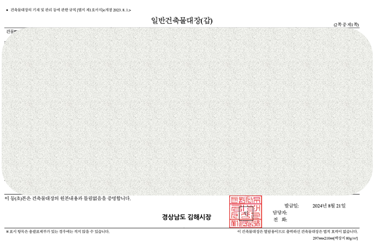 8/21 발급한 건축물대장. 위법건축물 표기는 없다.