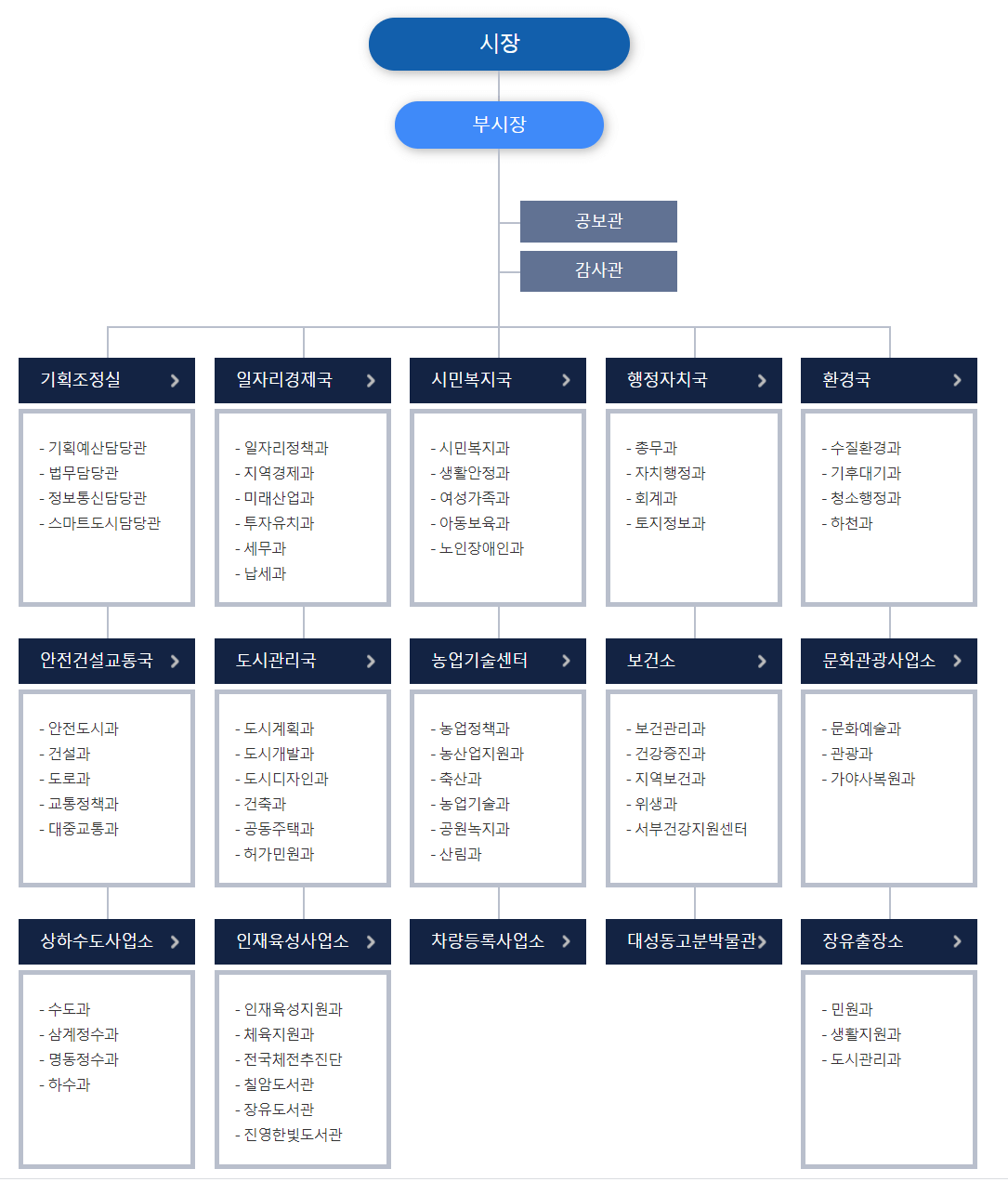 김해시청 조직도, 홈페이지에 각 업무분장까지 확인할 수 있다 (공공기관이라 업무분장까지 확인이 가능하다)