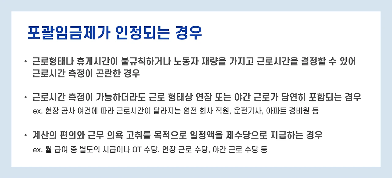 특히나 근무시간이 유연하여 근무시간 트래킹이 어렵고 업무시간 이전 혹은 이후에 차량운행이 많은 영업직의 경우 포괄임금제를 적용하는 게 어찌보면 맞는 사항일 수도 있다.