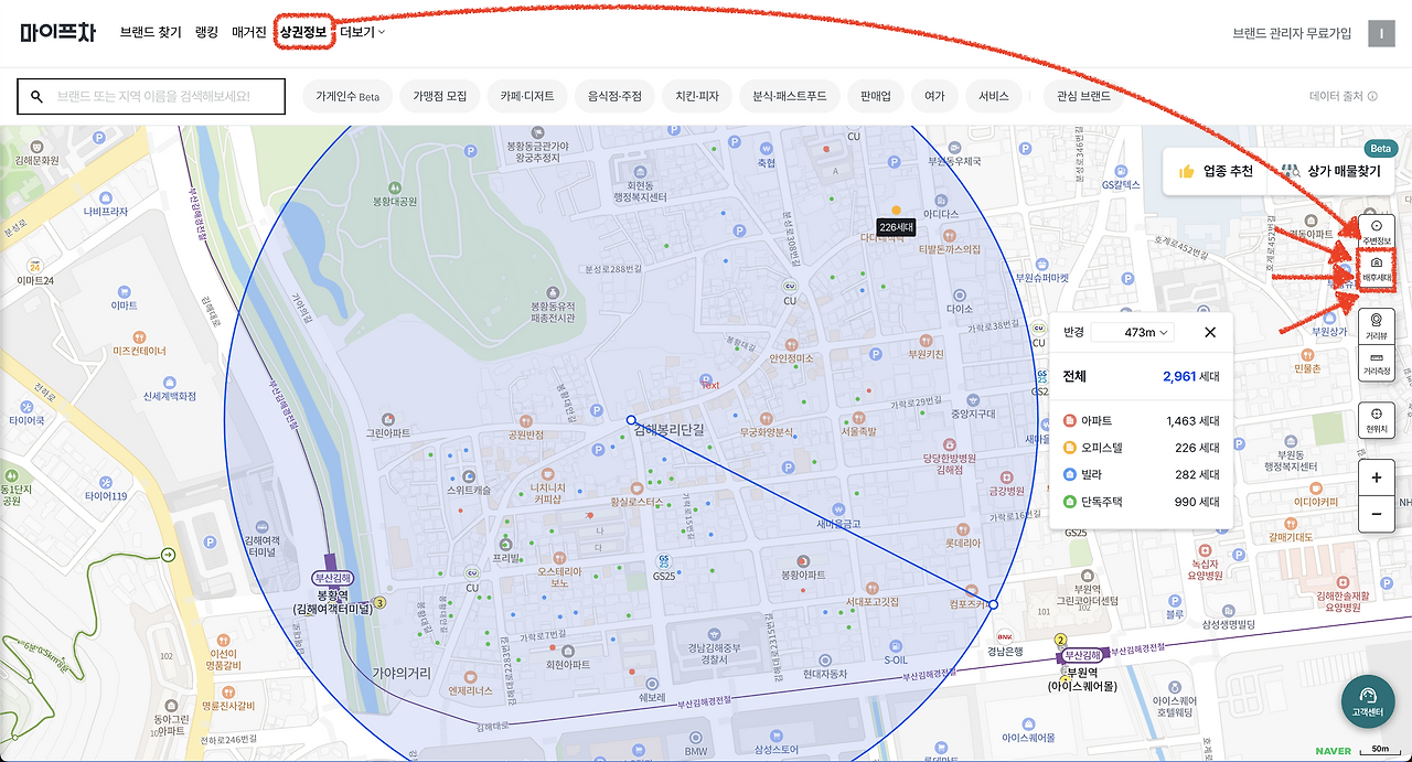 참고로 배후세대나 유동인구, 대략적인 주변상권을 파악하기 위해 마이프차(https://myfranchise.kr/)의 상권분석-배후세대 시스템을 활용했는데, 검색해서 찾은 것 치고 괜찮은 정보를 제공했다.