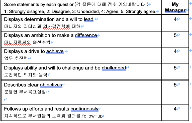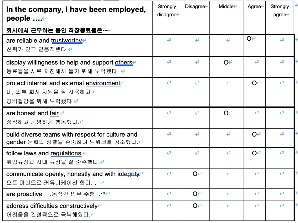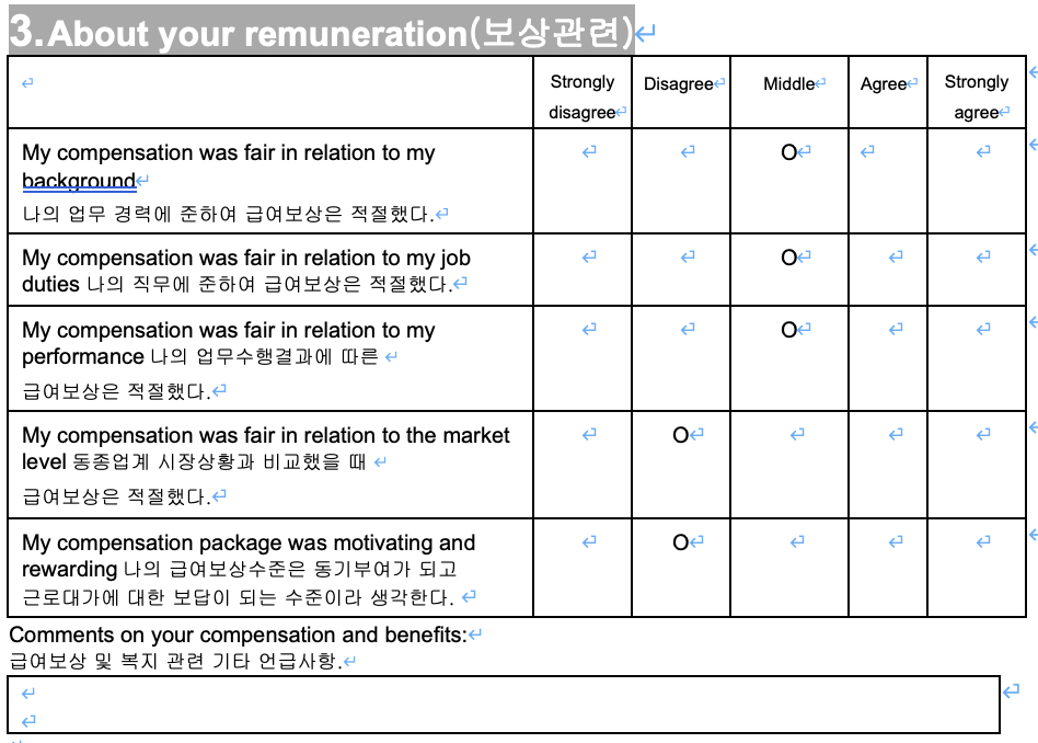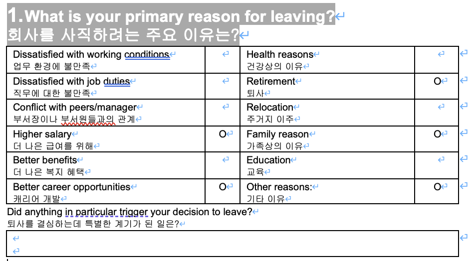 퇴사규칙을 보면 퇴사 전 퇴사면담을 하게 되어 있었다. 그리고 퇴사면담에는 어떤 이유로 퇴사하는지를 포함해서 향후 직장문화 개선을 위해 직장만족도 등을 조사하는 양식이 있었다. 문항은 총 8가지였는데, 내용은 다음과 같다.