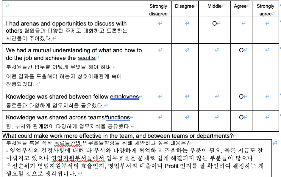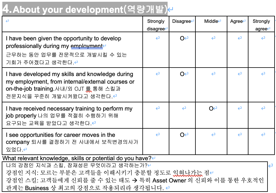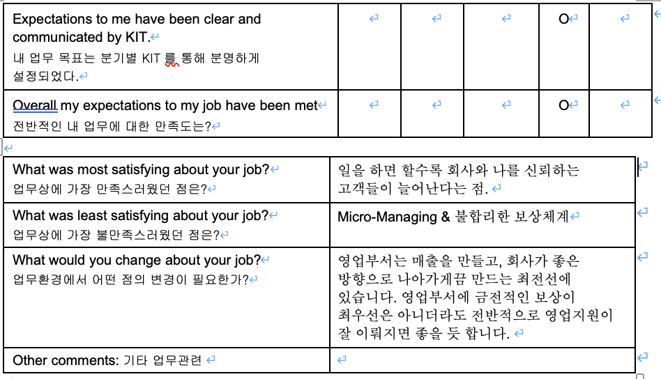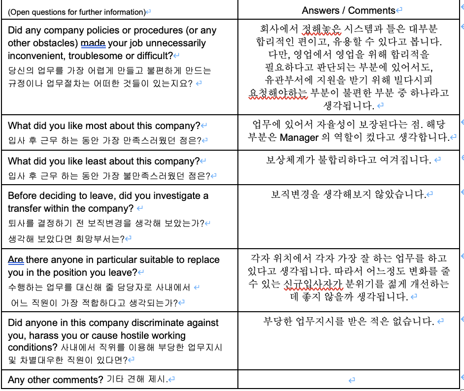 회사의 발전을 위해서 이 퇴사면담자료를 제출하고 왔어야하지만 누구도 제출하라고 하지 않더라. 심지어 면담을 해야하는 거 아니냐고 물어보았지만 그런 건 없더라. 그래도 많이 다져놓은 관계들이 아쉽고, 3년을 투자했던 시간과 노력이 물거품이 되는 게 아쉬워 적어본다.