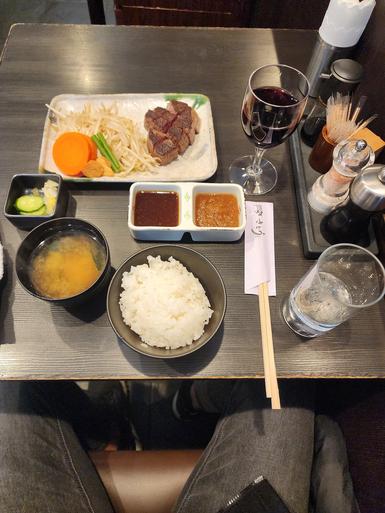 화장실은 비행기나 전철에 있는 것처럼 작았지만 깔끔하고 있을 건 다 있어서 불편함 없이 이용했다. 40분 정도 걸으니 출출해졌다. 그래서 Satou Kichijoji Steak House라는 식당으로 들어가 스테이크 오마카세와 레드와인을 한잔 주문 했다.