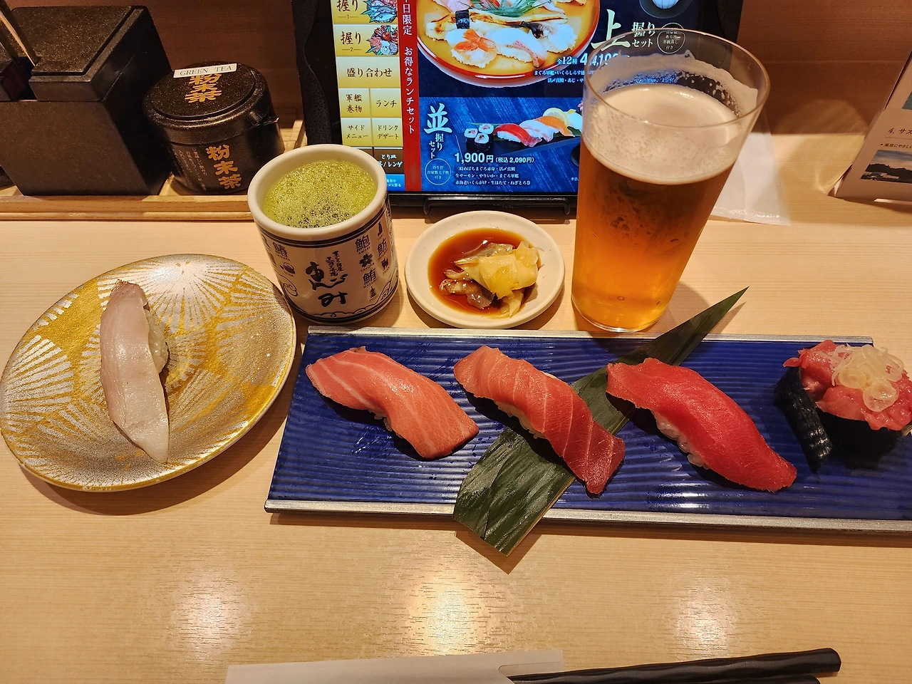 곧 주문한 생맥주와 참치 오카마세 5점이 나왔다. 생긴 건 한국의 고급 횟집과 유사한 느낌이 들었다. 접시 위에 놓인 다섯 점의 참치 스시는 보기만 해도 황홀했다.