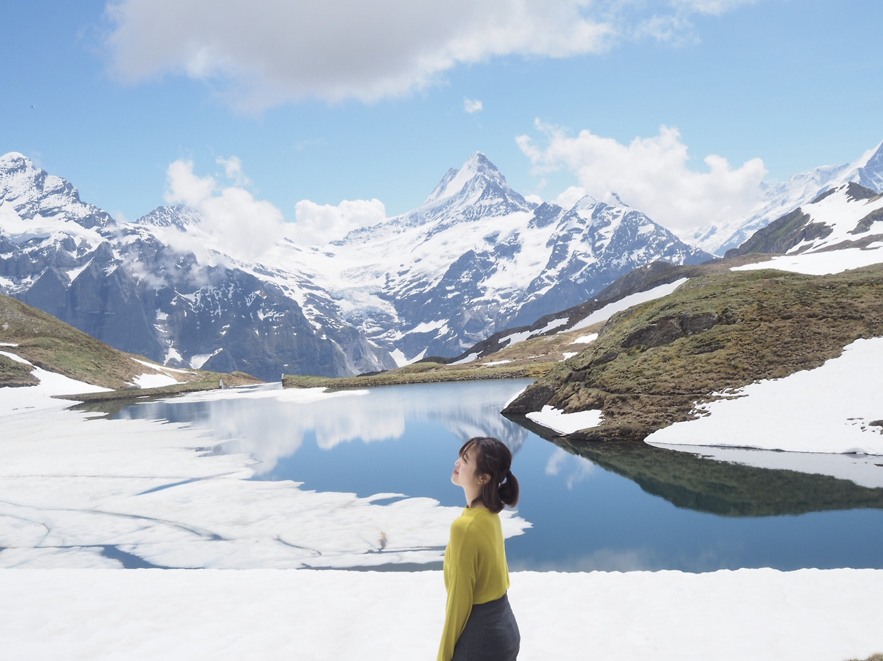 긴 하이킹 끝에 도착한 바흐알프제. 흐린 하늘 아래 설산과 호수의 경계가 분명하게 나뉘어 있었다. 곧장 짐을 풀고 소소한 피크닉을 시작한다. 아침 일찍 만들었다는 샌드위치를 받고 루체른에서 산 초콜릿을 건넨다. 산을 사랑하는 주영이는 들뜬 표정으로 호수를 산책했고, 나는 그 모습을 카메라에 담았다. 얼마 후, 구름이 걷히면서 호수에 비치는 것들이 더 강하게 존재를 드러냈다. 짧은 피크닉을 마치고 6월의 눈밭에 섰다.