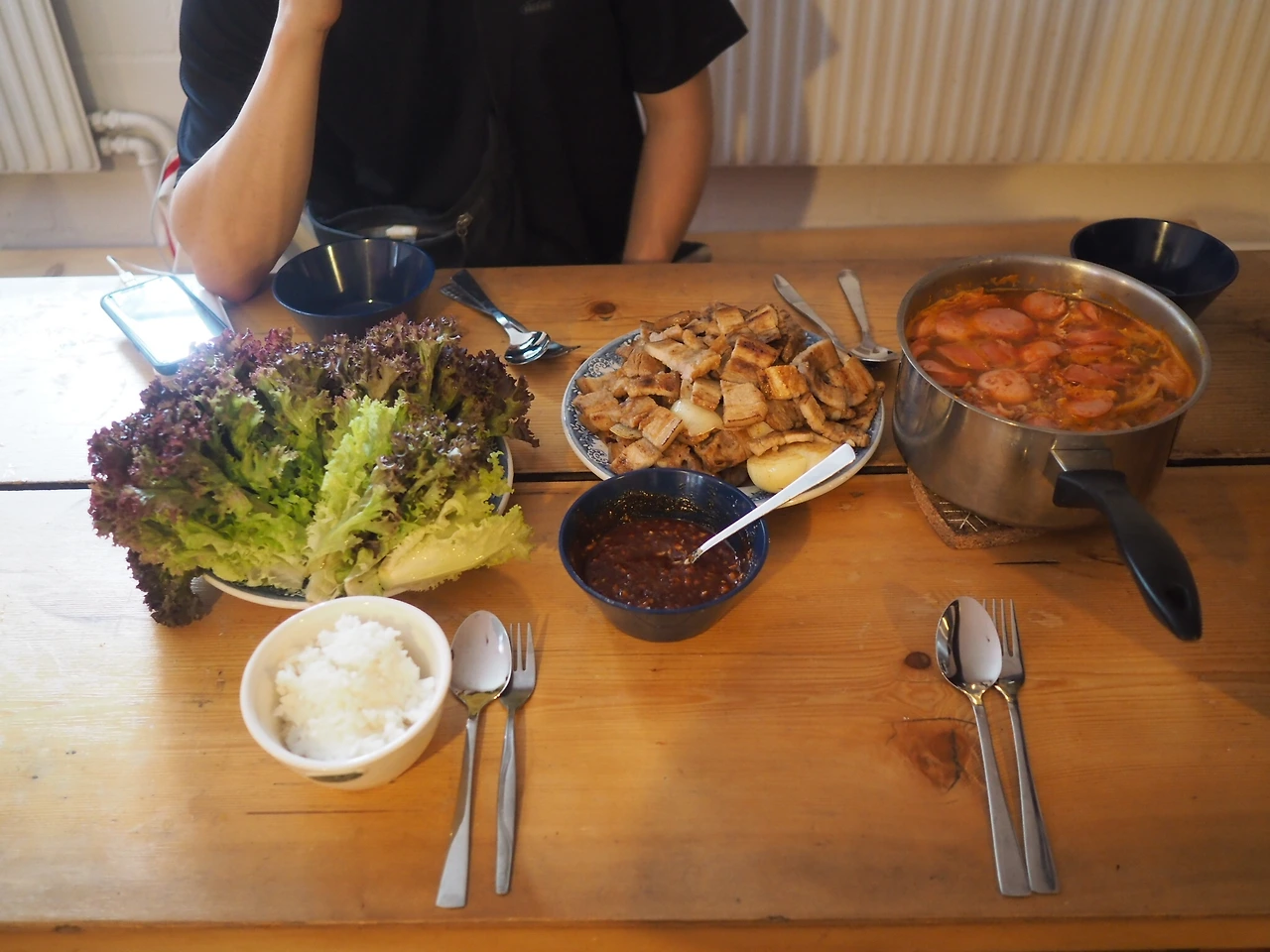 인터라켄으로 돌아가기 전에 쿱에 들렀다. 하루 종일 먹은 거라곤 샌드위치 한 조각과 초콜릿이 전부였던 우리는 눈을 반짝였다. 하지만 장기 여행자들에게 과소비는 금물. 1프랑짜리 캔 옥수수를 안고 열차에 올랐다. 맞은편에 앉은 승객과 눈이 마주친다. 그의 이마에 쓰인 투명한 문장. -저는 한국인입니다. 오지랖 넓은 나는 옥수수콘을 먹겠냐고 물었고, 우리는 그를 발머스-숙소-에 초대했다. “이따 고기 굽고 부대찌개 끓일 건데 올래요? 발머스에 있는 한국인은 저희가 전부예요.”
