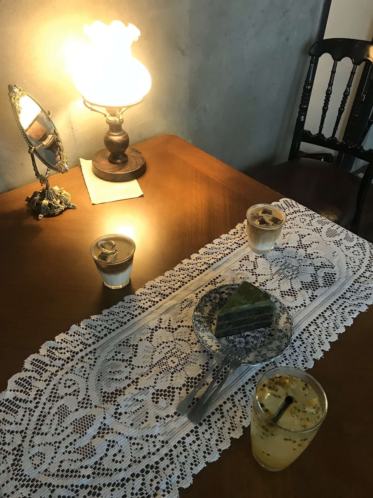 점심 식사를 마치고 근처 카페로 향한다. 갈색빛에 압도당하며 나무로 된 문을 연다. 예쁜 조명과 갖가지 천들, 자나 장미와 레이스 장식의 옷이 시선을 사로잡았다. 하지만 가장 마음에 드는 건 따로 있었다. 카페 안의 손님이 단 세 명뿐이었던 것. 벽 전체를 메운 악보 옆으로 감미로운 음악이 흐른다. 화려하진 않지만 마음을 뜨겁게 만드는 시간. 다시 만난 우리의 식탁 위로 달콤한 순간이 시작된다. 플랫 화이트와 말차 케이크, 사랑스러운 조합이다.