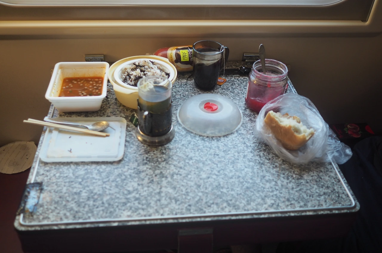 저녁, 배에서 쌀을 달라고 소리쳤고 더는 지체할 수 없었다. 배낭 깊숙한 곳에서 비장의 무기를 꺼냈다. 바하에게 라면 용기를 빌렸다. 뜨거운 물을 붓고 햇반을 넣는다. 10분 뒤, 설레는 마음으로 쌀의 상태를 확인한다. 이렇게 딱딱해도 되나 싶을 정도로 돌덩이 같은 밥이 지어졌다. 결국 뜨거운 물을 다시 받아서 참을 인을 몇 번이나 새겼다. 결과는 성공. 참는 자에게는 복이 있다더니, 열차에서 먹었던 모든 음식 중 단연 최고였다. 테이블 위를 정리하고 행복한 저녁을 맞았다.
