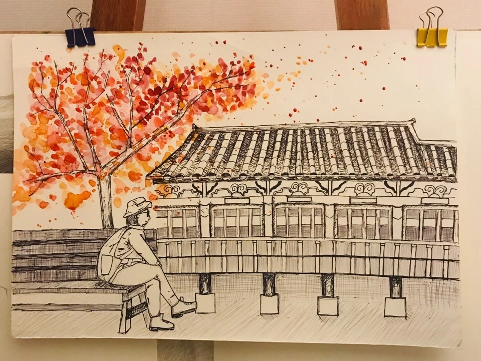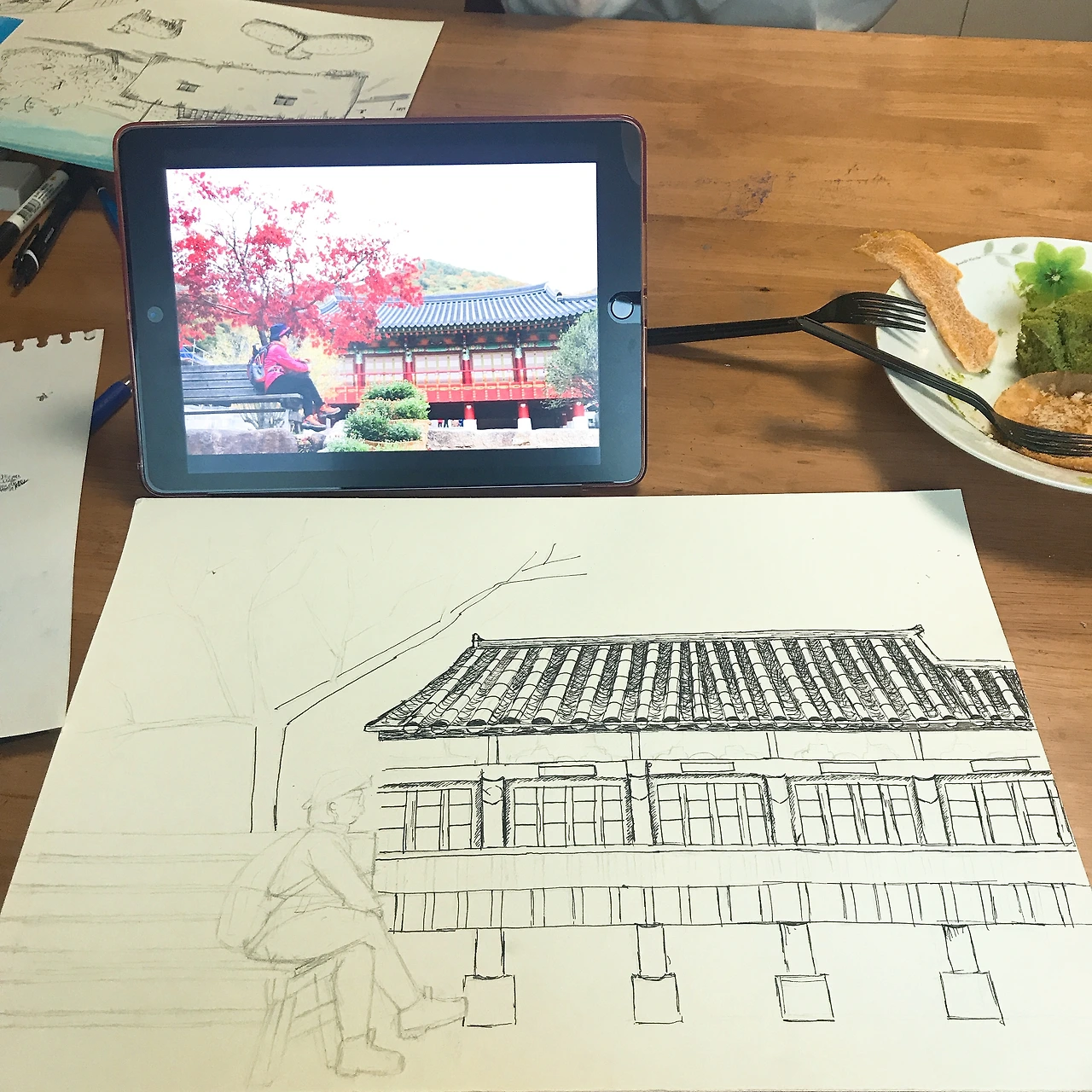 오늘도 역시 끝없는 펜터치의 길. 그래도 핵심 요소인 기와를 완성한 뒤라 큰 어려움은 없었다. 사실 펜 드로잉 하면 그냥 선 여러 개 긋는 정도라고 생각했는데, 펜을 어떻게 쓰느냐에 따라 명암 조절이 너무 멋지게 되었다.